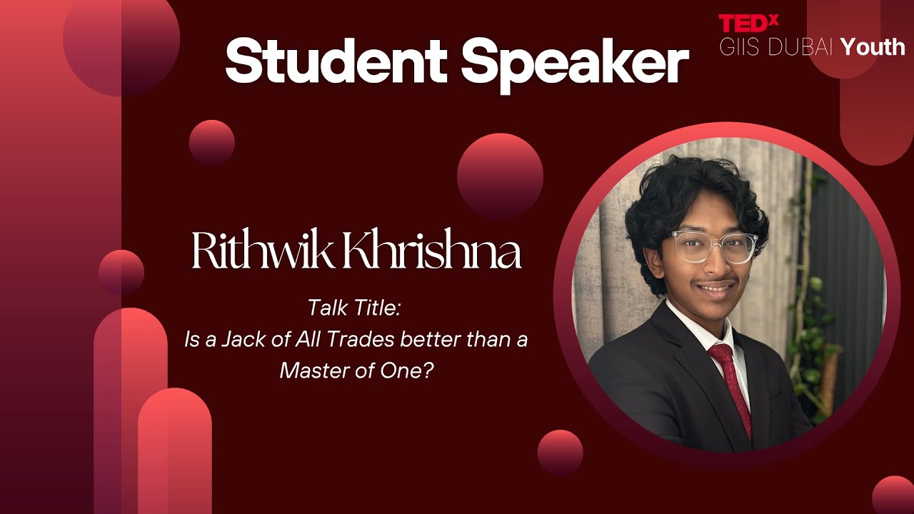 - 6:51Is a Jack of All Trades better than a Master of One? | Rithwik Krishna | TEDxGIIS Dubai"Is a Jack of All Trades better than a Master of One?" by Rithwik Krishna explores the balance between being a generalist and a specialist, inspired by the full quote “A jack of all trades is a master of none, though oftentimes better than a master of one.” Drawing on Isaiah Berlin’s “The Hedgehog and the Fox,” it celebrates versatility, adaptability, and interdisciplinary growth. Rithwik Krishna is an 11th grader who advocates that you don’t have to fit into just one box to excel. A seasoned MUN debater, Trinity-level pianist, lead in a school musical, and Secretary of his school’s Cultural Council, he channels his passion for the arts toward a greater calling to heal as a future doctor. In his talk, “Is a Jack of All Trades Better than a Master of One?”, he opens up about the struggles and surprising strengths of being a “generalist”. Through his own story, he’ll reveal why exploring different passions can be your biggest advantage, and why it’s not too late to diversify your skills. This talk was given at a TEDx event using the TED conference format but independently organized by a local community. Learn more at https://www.ted.com/tedx